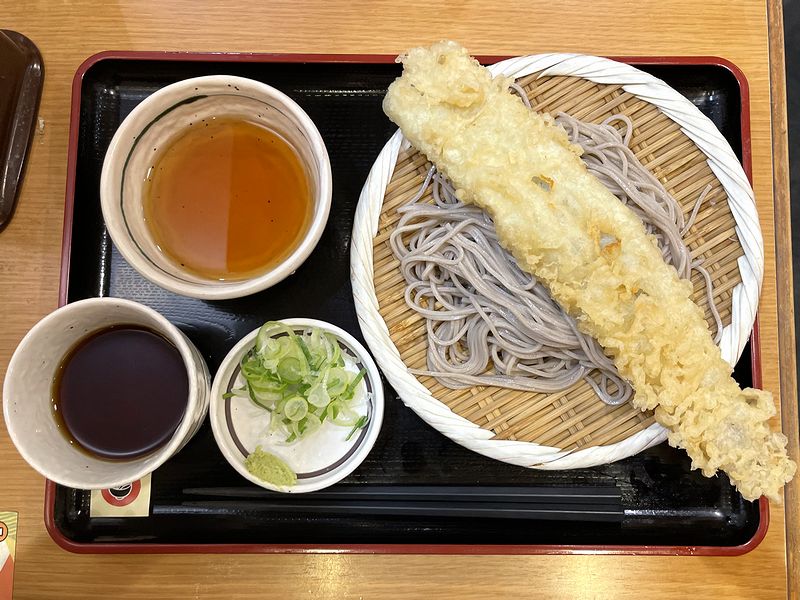 券売機の写真で見てはいたものの、実際に目の当たりにすると、ソバの上に載せられた穴子一本天の激ロング具合はインパクトありますね。