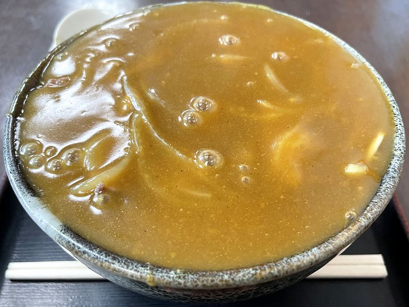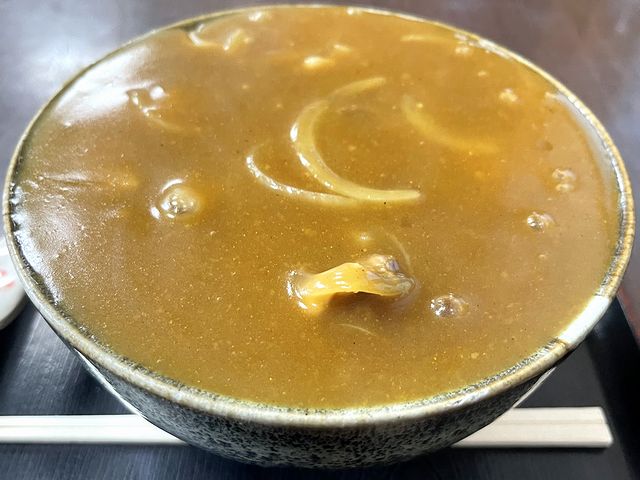 それと具は、やや厚めにスライスされた豚肉と、タマネギ。カレー南蛮という名前的には、肉は鶏肉、そしてネギは南蛮の由来たる長ネギの方がという向きもいるかと思いますが、個人的には、どちらでも良い派。実際豚肉は、食べ応えや旨味の強さは鶏肉に引けを取りませんし、タマネギの風味がカレーと良く合うのは周知の通り。