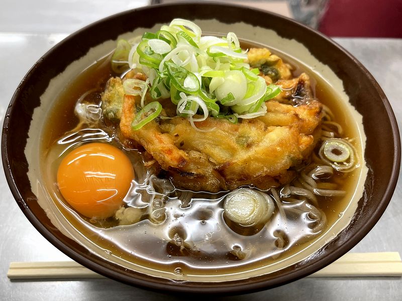 そしてかき揚げはタネがタマネギなど野菜メイン。ふわっとした食感で溶けたりはしませんが、ツユとの馴染み事態はとても良い感じ。途中から生玉子を崩し黄身と絡めると最高です。