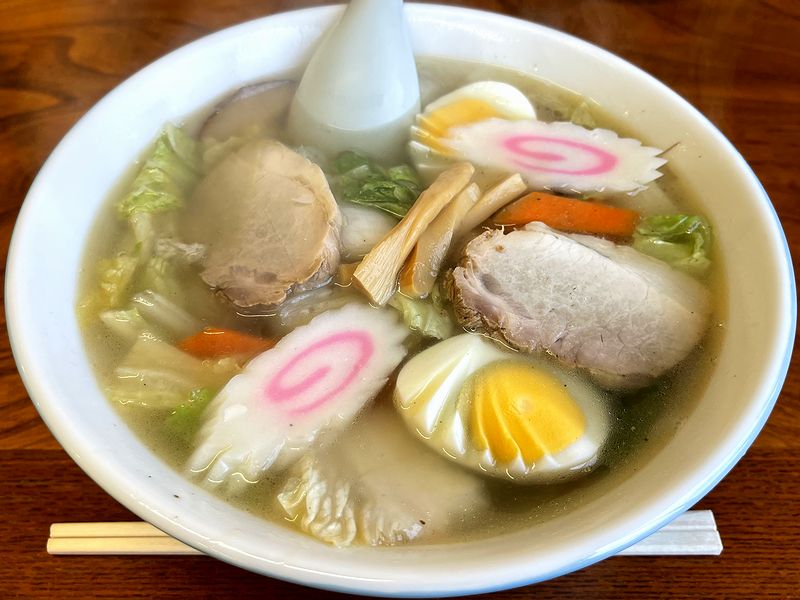 そして具は、ミシっとしてるけど柔らかさもある厚めの焼豚が2枚に、白菜、椎茸、人参と某塩ラーメンのCMを思い出す野菜類、更にタケノコ、ピーマン、メンマに茹で卵、そしてナルトと、9種類も載っています。記憶にある五目そばは、肉が片栗粉コーティングされた豚肉だったり、キクラゲが入っていたり、ちょっと高級になると海産物がナルトではなくイカだったりエビだったり(しかも片栗粉コーティング済み)するものの、色々載ってるって、単純に嬉しいものです。(これはこれでヨシ!)