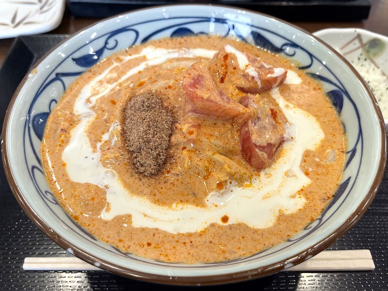 注文時、つい大盛りにしてしまったのですが、ビジュアル的には、元々あまりカレーうどんっぽくないトマたまが、豆乳によって色が明るくなり、更に上に載ったクリームと節粉のお陰で、どこかエスニカン。