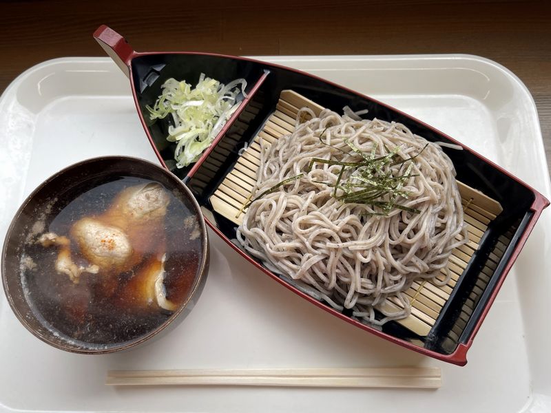 それで悩んだ末に、暑かったその日の気温などを考慮していただくことに決めたのが、POPに「名物!」と書かれた、舟ざる特製肉そば。器が船になっているのは、長瀞ライン下りをオマージュしたんですかね。(ちなみに、これまたPOPに「名物!」と書かれた暖かい特製肉そばは、通常の丼に入っているようでしたが。)