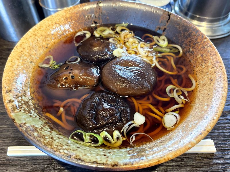 それがこの、しいたけそば。注文ほ受けると熟練の手さばきであっという間に完成。そばの上には椎茸が4つ載っているという、この手のお店ではあまり見ないビジュアルですね。