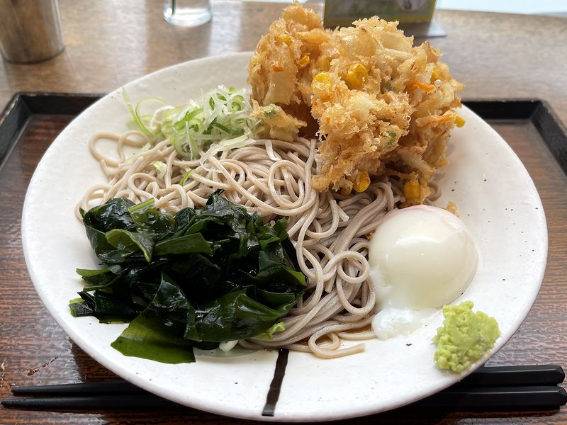 【とうもろこしのかき揚げそば(冷) 530円 + 温玉 120円】