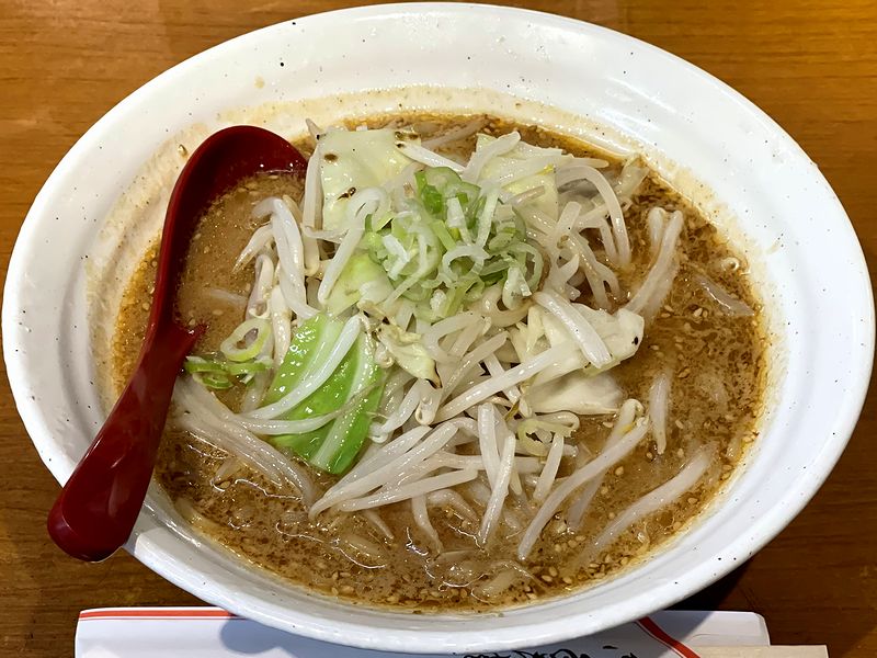 そして具は先述のとおり野菜のみで、キャベツとモヤシ、あと薬味の白ネギという構成。っていうか、スープが濃密な分、チャーシュー入っていない方が、個人的には良いバランスに感じます。あと、キャベツとモヤシは茹でではなく炒めだったのは嬉しいサプライズ。(メニュー写真見た時には茹で野菜だと思っていた。)炒め加減も絶妙で、熱は入っているけどシャッキリしているのがとても良い感じです。