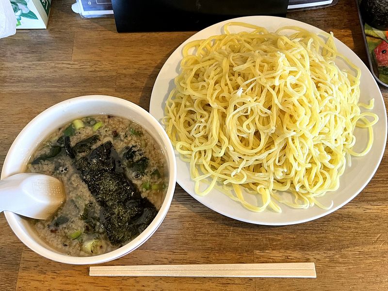 またつけ汁は、濁らせずに炊いた出汁が動物系だけではない素材感と思ったものの自信なし。それよりも醤油っ気が効いた甘みや酸味の殆どないスパルタンな味付けが特徴的で、そこに背脂でコクをプラス。更に、これは10年前にいただいた時の記憶に無い(けど、それよりも前、このブログを始める前にいただいた時の記憶には、勘違いかもしれないけど有る)つけ汁にたっぷり入るワカメが風味がグルタミン酸的旨味をプラスして。加えて海苔もその方向の風味を補強し、ネギが全体を引き締めているような。