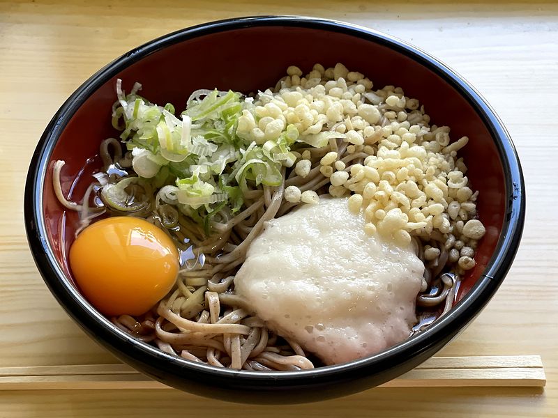 それで今回は、前回温かいそばをいただいていることと、それよりも夏の盛りでたいへん暑かっこともあって、「冷やし」とろろそばに、こちらのお店の卵は生卵だけということ(券売機にわざわざ注記してくれています)なので、それも追加して。店員のお姉さんが生卵を落としたあと、提供直前にツユを少量足してくれたように見えたのですが、生卵トッピングしたからですかね。
