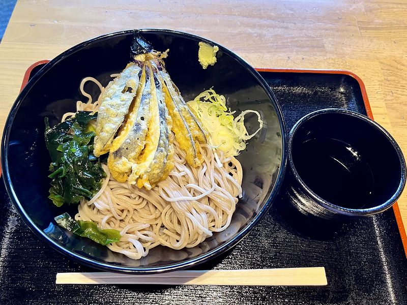 そして茄子天は、揚げたてで、衣カリっ中はトロとした最高の揚げ加減。そこに先述の上品なツユが絡んで、これがまた。あと、添えられたワカメも嬉しいですね。