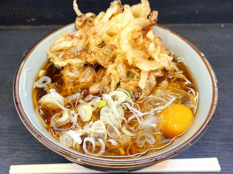 で、今回こそ、迷った時の個人的定番天玉そばということで、かき揚げ蕎麦と生玉子という組み合わせで注文。すると、サクサクっと手早く調理され、あっという間に登場しました。