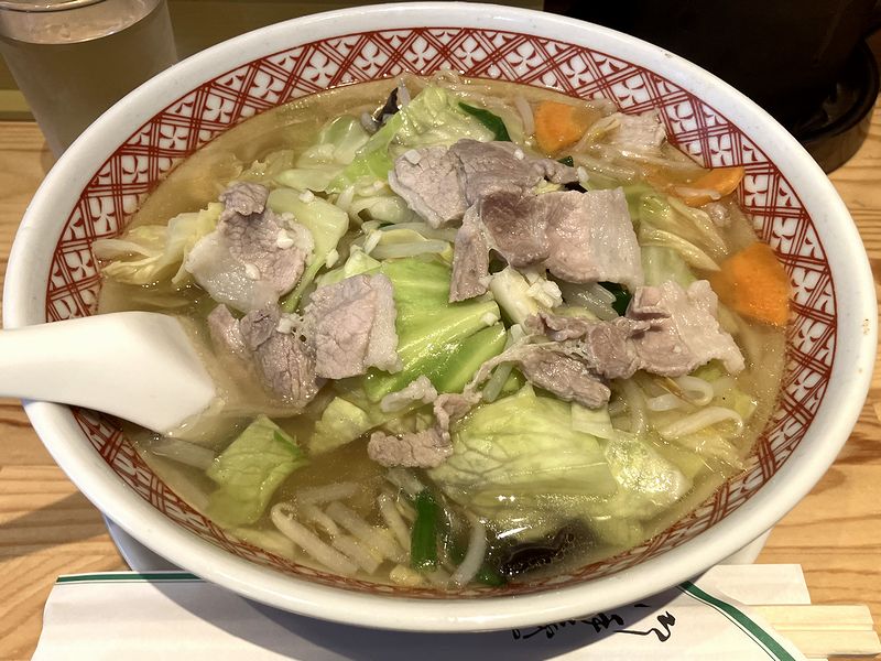 で、食券提出から少し待って登場した塩タンメンは、見た目的に、澄んだスープの正統派といったビジュアル。