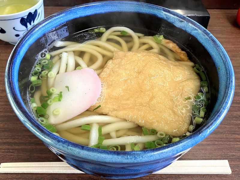 そんなわけで、結果的にきつねうどんだけの注文となり、出していただいたお茶を啜りつつ待つこと暫し。女性の店員さんが「熱いので気をつけてください」と言い添えつつ恭しく持ってきてくださいました。