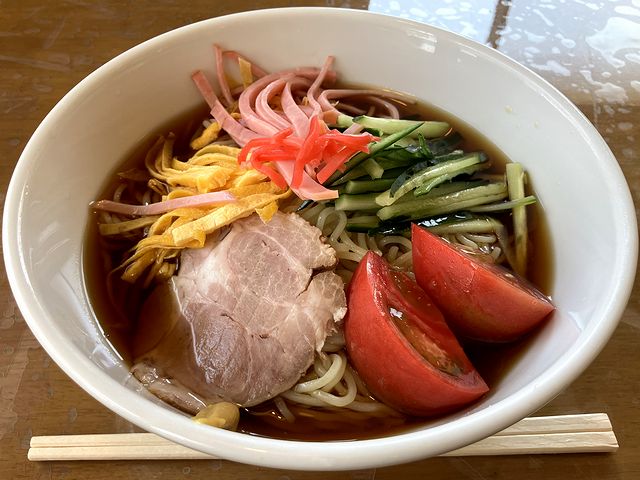 そして具は、1枚載っているチャーシューがまず嬉しく、さらには、手作りの薄焼き卵が泣かせます。あとは、ハム、キュウリ、トマト、紅生姜っといったベーシックかつ必要十分なもの。