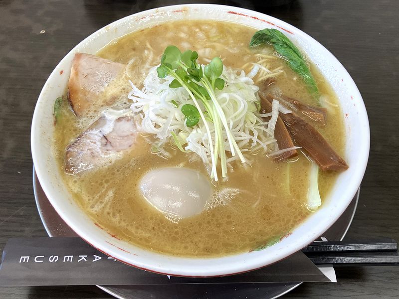 そして具は、味を引き締めてくれるたっぷりめの白ネギやカイワレ菜といった薬味系はもちろん、存在感があるチャーシューに、色が濃いけど柔らかめの味と食感なメンマや、絶妙な箸休めとなる青菜と、どれも欠かせない感。あと味玉は、黄身が固ゆでと半熟の中間くらいの固まり具合で、味がしっかり染みてます。
