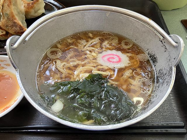 そして付属の半ラーメン(お店の方は「スープ」と呼んでいた)は、昔ながらのラーメン専門店といった感じの澄んであっさりしたベースに、程よく醤油ダレが効かされた、これまたベーシックな味わいのもの。そこに、表面ツルっ、噛むとモチモチの手もみ麺が合わさって、これが、もう。具は、ワカメとメンマ、ナルトくらいですが、これで十分なんですよね。