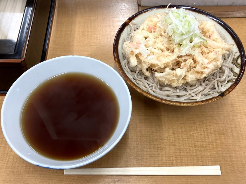 またかき揚げは、揚げたての熱々ではありませんが、サクサクとしたクリスプ感はかなりのもの。タネはタマネギと桜海老様の小エビというのも、当地らしいというか、子供の頃から自宅でも食べていた組み合わせなんですよね。それを、最初はそのまま、途中からつゆに浸してソバと一緒に口に入れれば、これが、また。