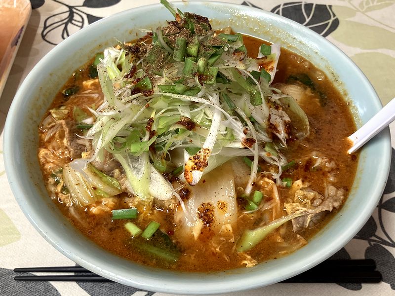 見た目的には、玉子の浮いた赤い色のスープの上に、てんこ盛りの白ネギ、青ネギ、ニラの刻んだ者が載り、更にその上からかけてあるのが、唐辛子入りのラー油と粉山椒でしょうか?なかなかに情報量のあるビジュアルです。