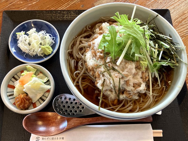 それで私がいただいたのが、こちらの、冷かけおろし納豆そば。名前のとおり、冷たいツユの張られた器に入ったソバの上に、大根おろしと納豆が混ざったものが載り、更には水菜と刻み海苔があしらわれていて、ネギとワサビの薬味は別皿に。あと、お新香とそば味噌の載った小皿が添えられていました。