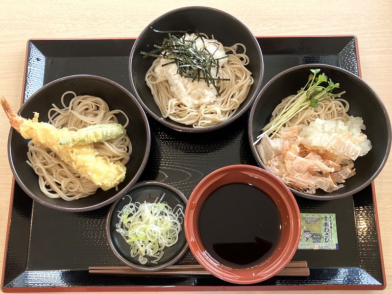 食券提出から程なくして番号が呼ばれ、太郎三昧そばとご対面。3つの器に入ったソバの量は、全体で1.5人前くらいあるでしようか?また3種類分ということで、ツユがわりと大きめの器にたっぷりと提供されます。とりあえず箸とワサビを取りつつ席に戻り、どのように攻略するか少しだけ悩んだのち、薬味のネギ、そしてツユを1/3づつ、それぞれのそばにかけていただくことにしました。