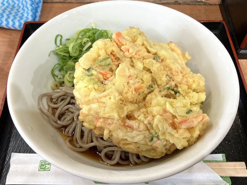 券売機は店内にあり、ここも豊富なメニューで迷いましたが、この日は暑くて身体が冷たい食べ物を求めていたのと、このあと乗り継ぎの都合で暫く食べられないことがわかっていたので、おにぎりとかき揚げそばのセットと、冷たい麺に変更する食券を購入。男性の店員さんが、一度湯通しした麺を、冷たくなるまで氷でしっかり締める様を見て、有り難いな。と。