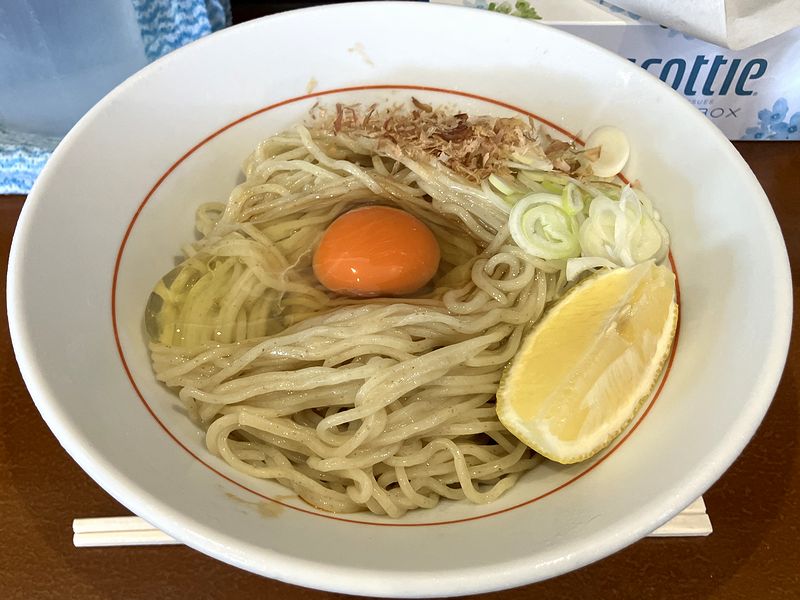 まず麺は、こちらのお店の背脂煮干し系のメニューに使われる幅広タイプじゃなく、中華そばなどそれ以外の品に使われている全粒粉を使ったもので、その風味が良いのと、ツルっとした喉越し、グミシコっとした弾力が良い感じ。タレはガツンとした主張があるというよりも、玉子と一体になって麺を美味しく食べさせてくれるようなチューニングで、ネギと鰹節がうるさすぎない程度にアクセントを加えます。そして、レモンがまた。途中から味変的に使用しましたが、その酸味が味を引き締め、香りも邪魔にならず、むしろ、人によっては苦手な生卵独特のにおいを抑えてくれるように感じました。