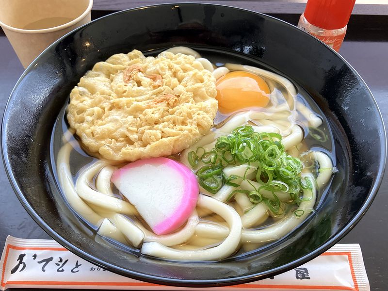 空いた席に座って待つこと少し。注文したかき揚げうどん+玉子が登場。かまぼこが載っているのを見て、ちょっと嬉しくなったというか、以前、ホームで食べた時も載っていましたっけ。他にも、色の淡いツユや後述するかき揚げなど、見た目からして懐かしいというか。(ただ丼だけ、ブログの記事にした時とは違いますが。)