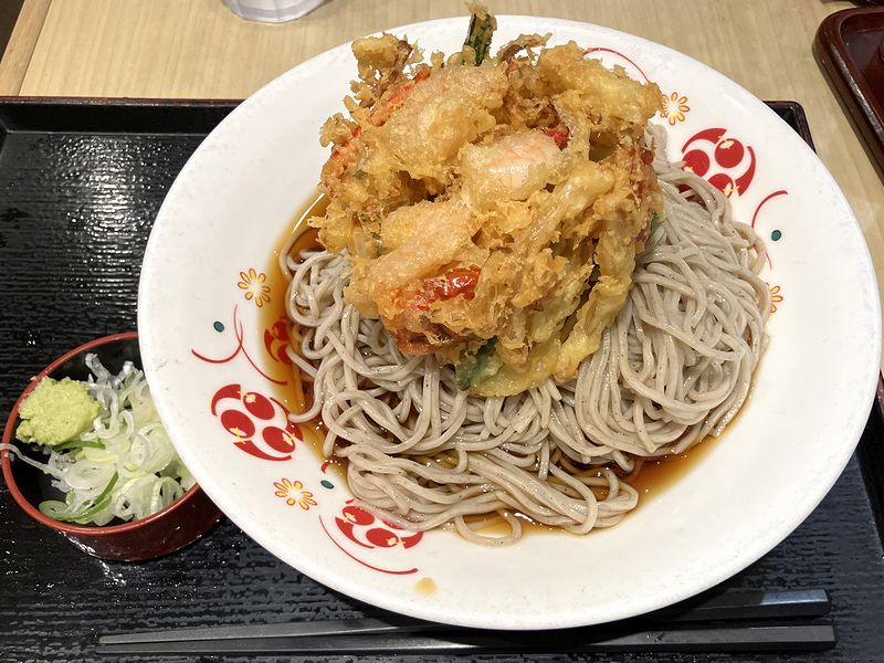 それでこの時、昨年夏もやっていた、100円お得に並盛りの倍量がいただける「麺2倍盛りキャンペーン」(ちなみに、昨年いただいたのはこの品とこの品)が再び開催されていたので、そのキャンペーンメニューのなから、海老とオクラの冷しかき揚げそばをいってみることに。