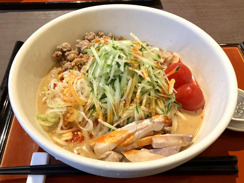 注文は食券制で、お店に入ったところにある券売機で買うようになっていますが、私はお店のSNSを通して知っていた夏季限定の黒酢冷やし担々麺、家人はベーシックな担々麺の食券を購入。