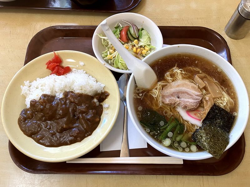 そしてカレーは逆に、昔の食堂でたまに出てきた、妙に塩気が薄くてウスターソースをジャバジャバ掛けないと食べられないようなもの(っていうか、昔、食堂に行くと何故か、安牌である筈のカレーで外すことが多かったんですよね……。)ではなく、辛さは万人向けながら、しっかりとした味付けが、何とも良い感じ。あと「半」カレーですが、実際は3/4位の量に感じたりして。