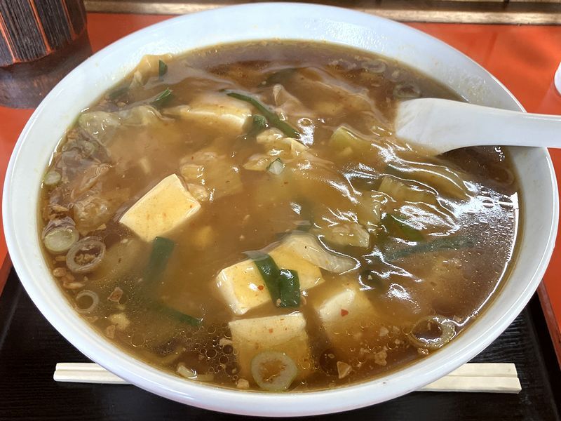 で、初めて目にする特製五十番ラーメン。見た目的には、醤油ラーメンの上に豆腐と唐辛子の入った餡が載って、一見するとちょっと変わった麻婆ラーメンのよう。