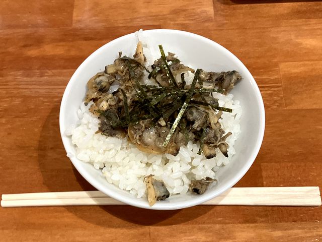 こちらは、一緒にいただいた品ですが、今回は合間合間にいただくのではなく、ラーメンの麺や具を食べ終えた後、残ったスープを掛けてズルズルと。ちと塩分が気にはなりますが、より、貝の味わいを堪能できたというか。