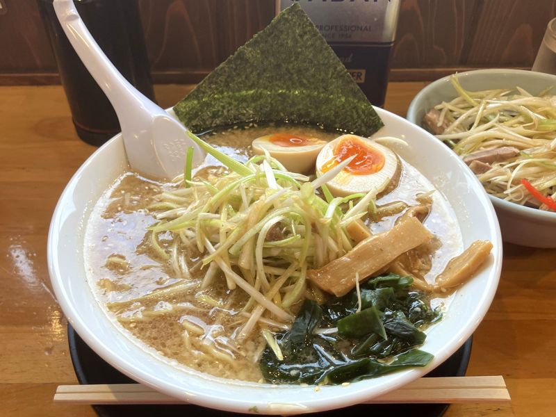 自家製の細麺は、食べ始めは加水率低めっぽいモシャっとした歯応え、途中からはスープと馴染むといういつのも食感。卓上のラージャンをレンゲにとり、そこに付けるようにいただいても良し。更にタレで和えたごま油の香りを纏ったネギ(とチャーシュー)と一緒にいただいても良し。今回はサイドメニューがネギとろろ丼なので、載っているすべてをラーメンだけで消費できるのも嬉しいところです。
