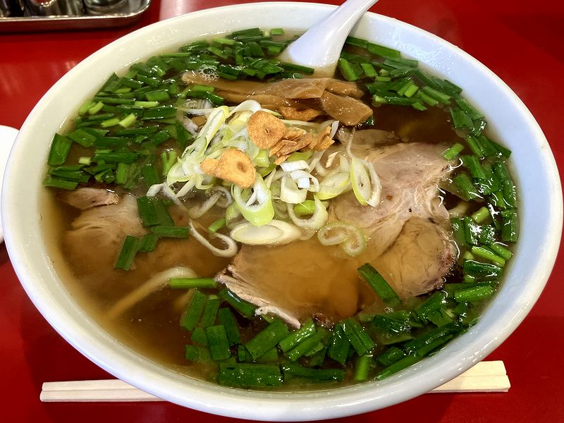 まずはスープからいってみたところ、そうそう、この味!動物系メインの風通しが良い出汁に、醤油ダレが穏やかに効く感じ。そこに薬味の白ネギと、追加したニラ+揚げニンニクが、これまた穏やか「葷」の風味や香ばしさを追加して。