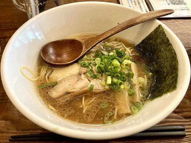 で、そのお店は、店構えからしてお洒落な作り。店名のとおり、夜は鶏料理メインの飲み屋さんとなるようですが、昼は鶏メインのラーメンも提供しているよう。更にこの日は、曜日限定メニューもあったようですが、予備知識も無い初めてのお店で頼むのは、メニューの筆頭に書いてある品だと決めている(例外もままありますが……。)ので、鶏そばをお願いすることに。