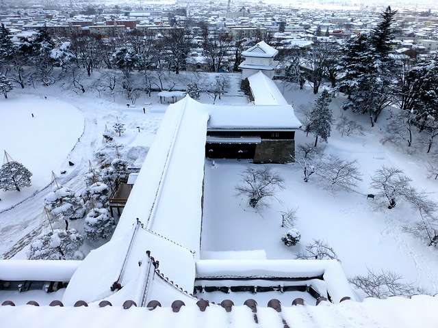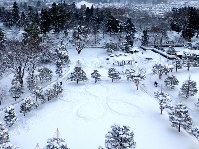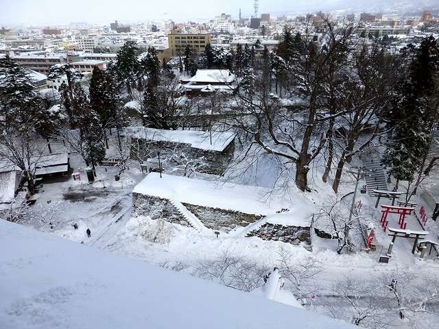 天主からは城下が一望。周りに高い建物が無いのでことさらパノラマ感が強調されますね。今回は雪模様だったので、今回は天気の良い時に来てみたいです。また、西方向の庭には桜の花模様が描いてあったのですが、2月8・9日に行われた会津絵ろうそく祭りの地上絵の物だったのですね。
