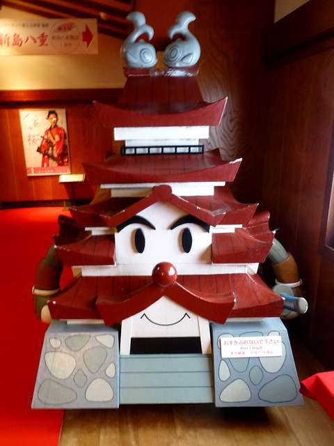 天主を一通り見学した後は、売店エリアの走長屋を抜け、平成12年に復元された南走長屋と干飯櫓を見学。で、南走長屋の手前には、会津若松市観光PRキャラクターのお城ボくんが鎮座していました。