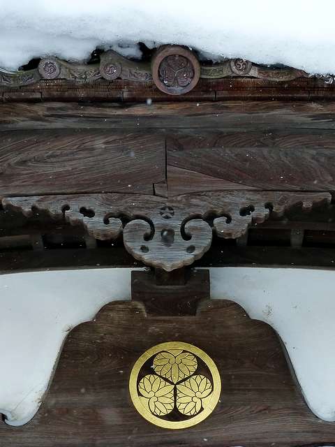 こちらには、会津若松城本丸にあった御三階が移築されているのですが、会津戦争で失われた本堂の替わりとして使用されていたとのこと。で、この御三階、外見は3層櫓ですが内部は4層になっているそうです。また、正面の唐破風は本丸玄関の一部だそうで、瓦と妻板には三つ葵があしらわれているのですが、どちらも会津葵ではなく、妻板部分の物は江戸末期に使われたというの13芯の徳川葵、瓦には9芯の物が使われていました。