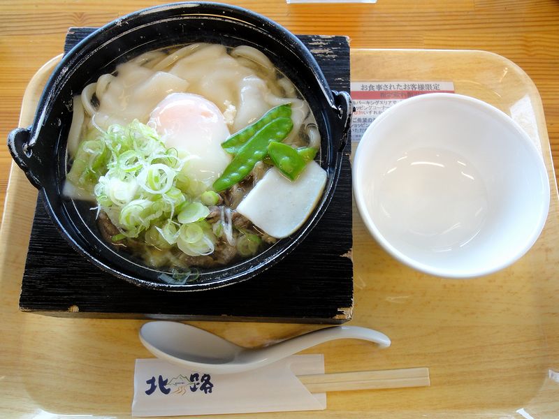 それでいただいたのは、券売機の一番下に、ひっそりとボタンがあったこの品。(ちなみにここも最近増えてきた食券を買うと自動的に注文が通る券売機です。)まずはつゆですが、色の薄さが富山県でも石川県に近い感じがするというか。塩気も充分で、具の牛肉の旨味と風味が充分に出ています。後述する同行者のいただいたいた品よりだいぶ遅れて提供されたので、その分よっくと煮込まれていると思われます。また饂飩は、つゆの味が染みていますが、煮込んでも歯応えが結構残っています。デンプンなどで強化したタイプの物でしょうか?(間違っていたら申し訳ない。)そして具は、たっぷりの牛肉と、薄くスライスされた餅、それと半熟卵など。それにしても卵と牛肉は良く合いますね。
