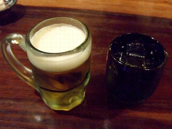 で、これらと一緒にいただく飲み物は、とりあえずオリオンを。あと、ビールと一緒に写っているサンピン茶は同行者がいただいた物。ちなみにサンピン茶とはジャスミン茶のことで、特にアイスとかホットとか言わなかったのですが、氷が入った冷たい状態で出てきました。